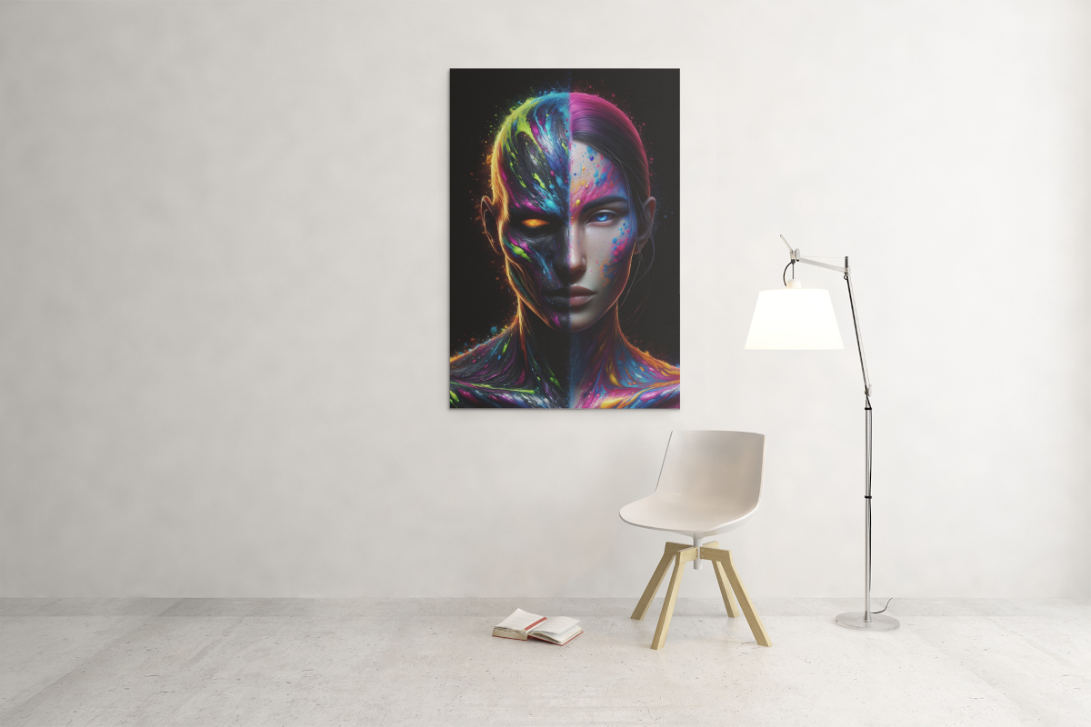 Moderný fotoobraz s pôsobivým farebným portrétom ženy, ktorý spája temnú a svetlú stránku osobnosti. Tento výrazný umelecký kúsok oživí každý interiér a prinesie jedinečnú atmosféru do vašej obývačky, pracovne alebo kancelárie.