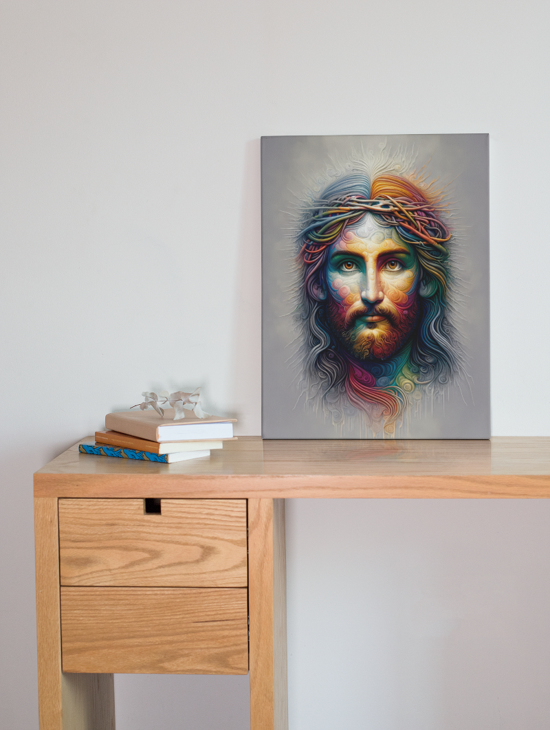 Fotoobraz s moderným a farebným zobrazením Ježiša Krista s tŕňovou korunou, ktorý spája tradičný symbol s umeleckým a súčasným štýlom. Ideálny ako duchovný doplnok do domácnosti, kaplnky alebo ako jedinečný darček.