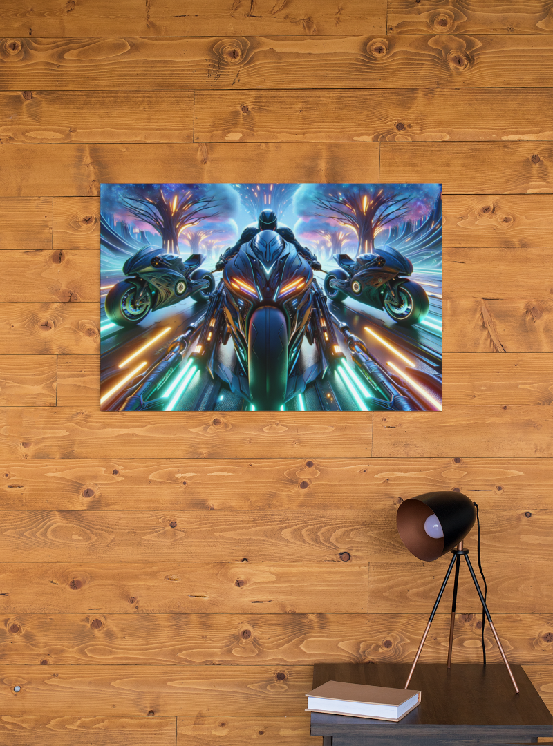 Dynamický a energický fotoobraz futuristických motoriek, ktorý dodá vášmu interiéru štýl, rýchlosť a moderný nádych. Perfektný doplnok pre fanúšikov motoriek, sci-fi a akčných scén. Hodí sa do obývačky, herne alebo kancelárie.