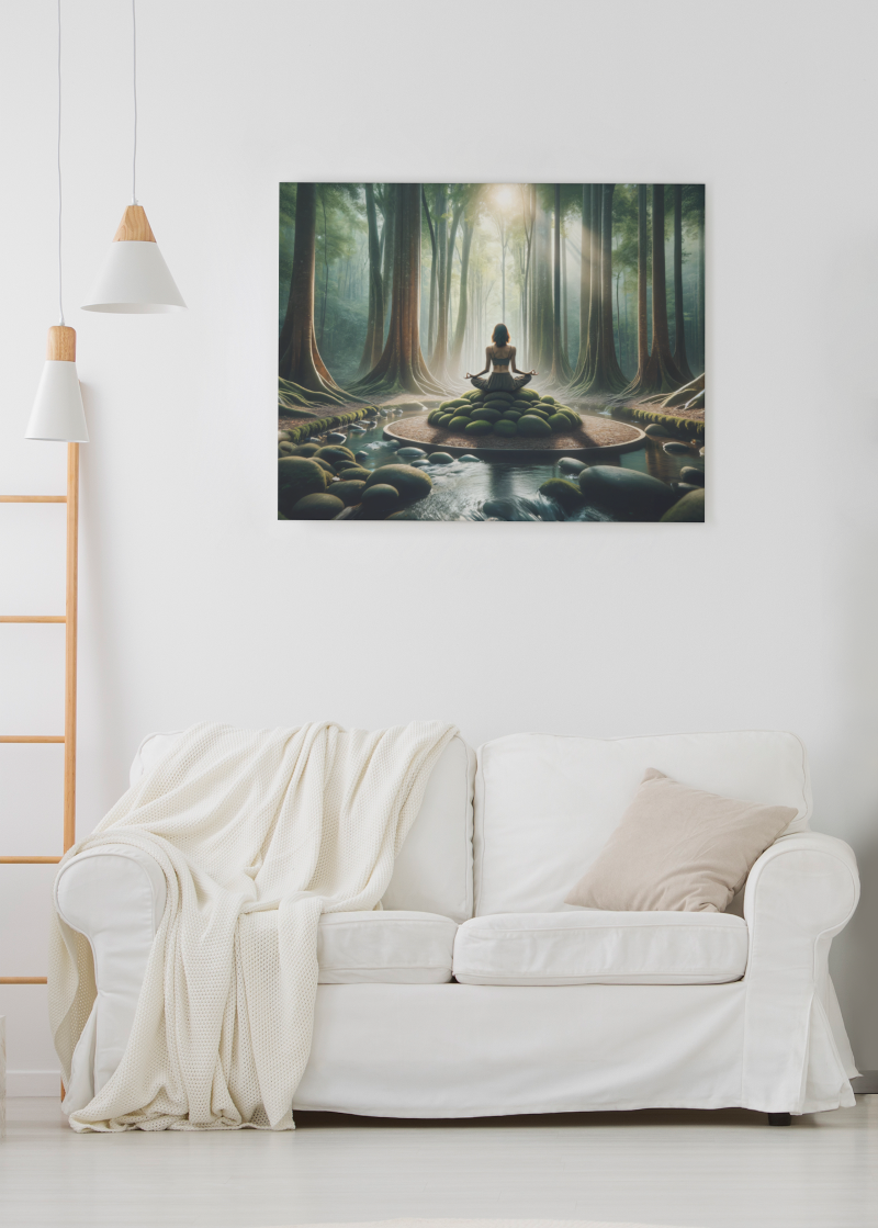 Fotoobraz s pokojnou scénou meditujúcej postavy uprostred lesa, obklopenej machom, potokom a slnečnými lúčmi prenikajúcimi cez stromy. Tento obraz prinesie do vášho domova harmóniu, pokoj a relaxačnú atmosféru. Ideálny doplnok do obývačky, spálne alebo meditačného kútika.