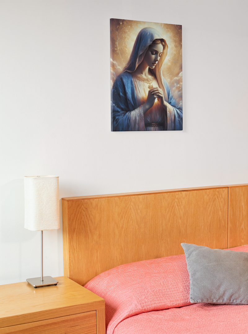Elegantný fotoobraz Panny Márie s jemnými detailmi a svätožiarou, ktorý vnesie pokoj, duchovno a nádej do vášho domova, kaplnky alebo modlitebného kútika. Skvelý darček pre veriacich a všetkých, ktorí hľadajú duchovnú inšpiráciu.