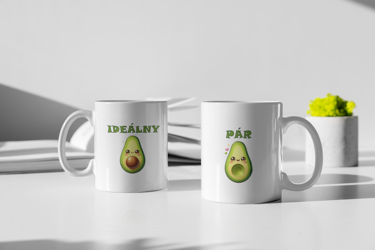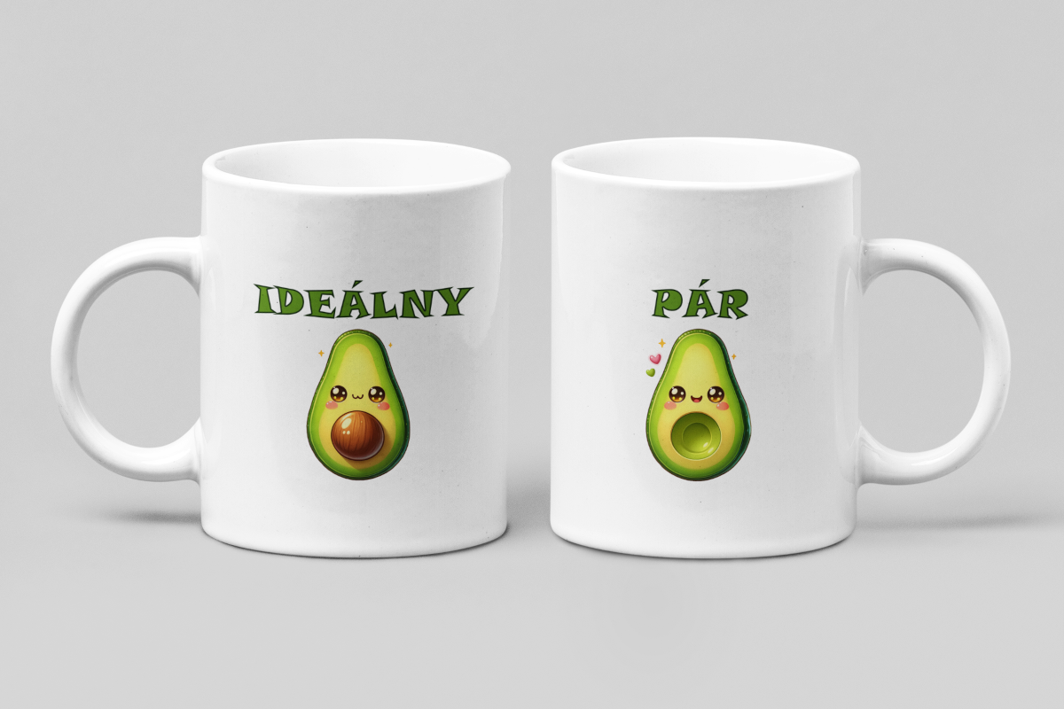 Roztomilá dvojica hrnčekov s motívom avokáda a nápisom „Ideálny pár“. Skvelý darček pre partnerov alebo kamarátov. Hrnčeky sú z kvalitnej keramiky, vhodné na horúce aj studené nápoje.