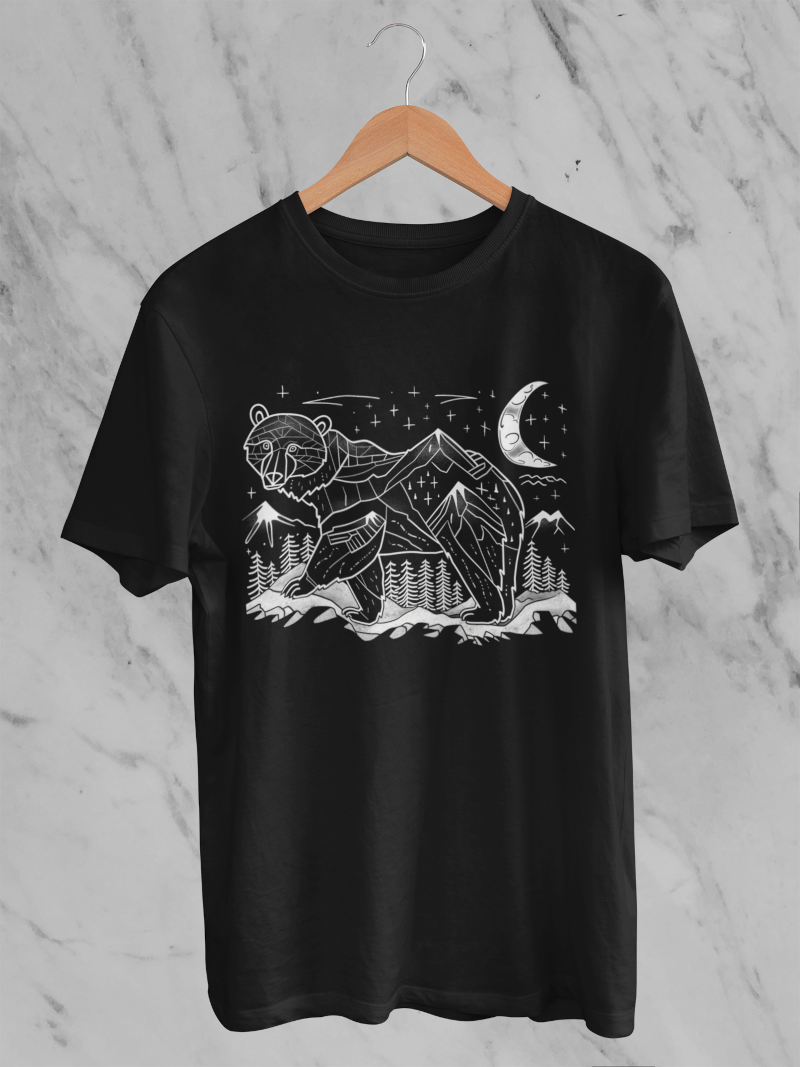 Toto jedinečné tričko spája silu prírody s tajomnou nočnou krajinou. Medveď s horskou krajinou v sebe, mesiacom nad hlavou a hviezdami okolo pôsobí ako symbol slobody a sily. Ideálne pre milovníkov prírody, turistiky, lesov a nočného neba. Originálny darček pre tých, ktorí sa cítia najviac doma v tichu lesa.